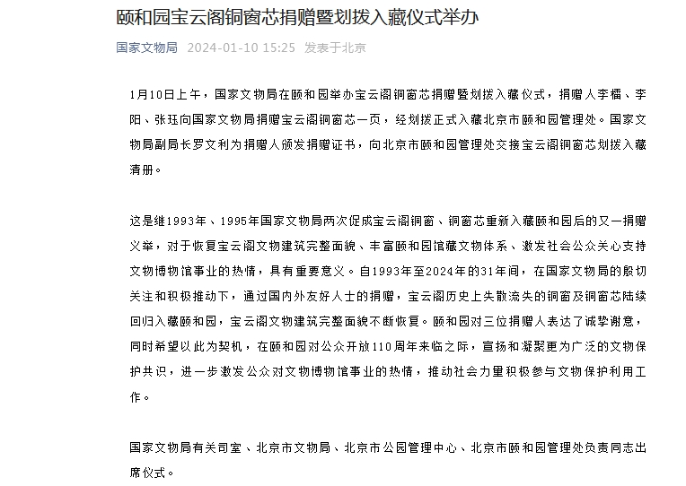 据国家文物局官方微信消息,1月10日上午,国家文物局在颐和园举办宝云阁铜窗芯捐赠暨划拨入藏仪式,捐赠人李檑、李阳、张珏向国家文物局捐赠宝云阁铜窗芯一页,经划拨正式入藏北京市颐和园管理处。国家文物局副局长罗文利为捐赠人颁发捐赠证书,向北京市颐和园管理处交接宝云阁铜窗芯划拨入藏清册。