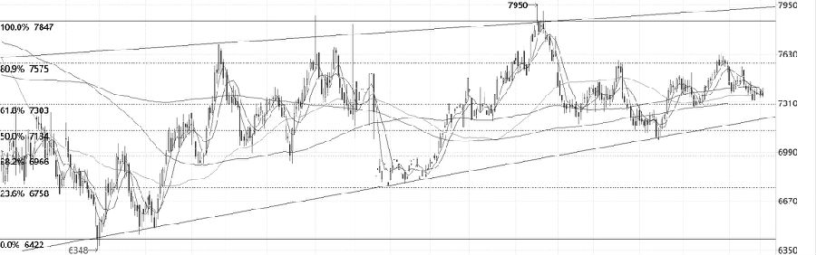 2022年下半年以来,短纤期货呈现振荡走势,振荡区间为6350—7950元/吨。近期,短纤期货反弹至黄金分割0.809对应的7575元/吨的压力位受阻,价格开始回落至黄金分割0.618对应的7300元/吨的支撑位附近。