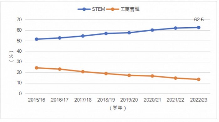 自2015/2016学年以来,中国在美留学学生攻读STEM专业的学生比例持续增加,并于2020/2021学年超过60%,2022/23学年达到62.5%,大幅高于国际学生在美留学选择STEM领域的总体水平(55%)。