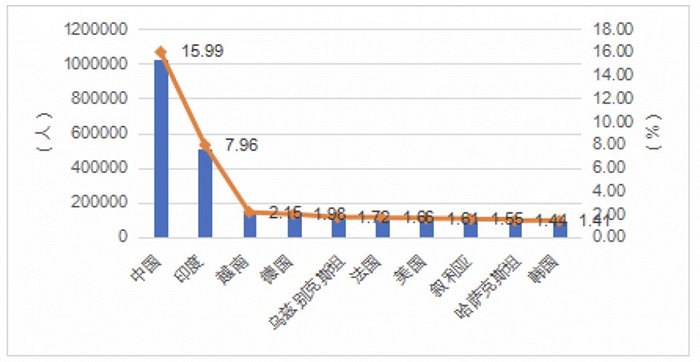 中国、印度均为美国国际学生的主要生源地,来自这两国的国际学生占美国高等教育机构国际学生的52.8%,但在美中国留学生呈现波动下降并渐趋稳定的态势,而在美印度留学生则持续快速增长。