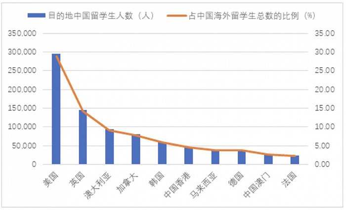 据联合国教科文组织UNESCO数据,中国学生前五大留学目的地分别为美国、英国、澳大利亚、加拿大、韩国,占比分别为28.92%、14.27%、9.15%、7.81%、5.81%。这五个国家的中国留学生占中国海外留学生总数的65.96%。