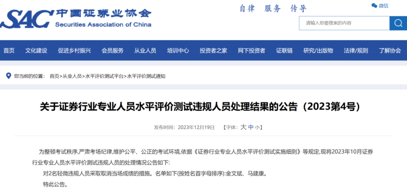 12月19日,中证协发布了《关于证券行业专业人员水平评价测试违规人员处理结果的公告(2023第4号)》。