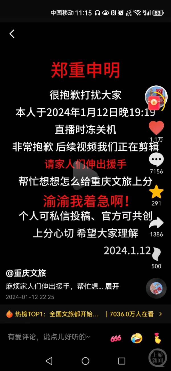 1月13日,上游新闻记者联系到重庆市文旅委信息中心的工作人员,她表示:“这条视频的确是我们官方发布的,大概是昨晚10点半左右发布的。”